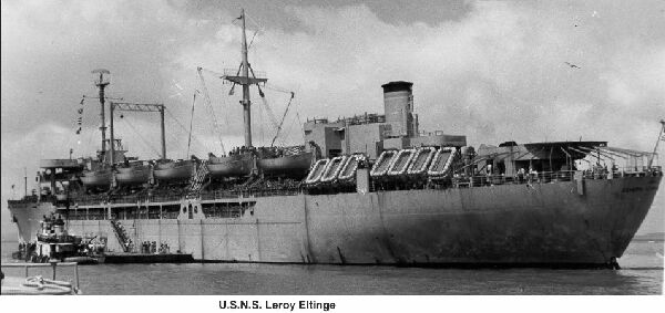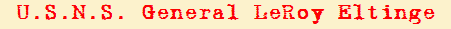 General LeRoy Eltinge (AP-154) was launched 20 September 1944 by Kaiser Shipbuilding Co., Inc., Yard 3, Richmond, Calif.; sponsored by Mrs. James McCloud; acquired by the Navy and commissioned 21 February 1945, Capt. W. Wakefield in command.After shakedown out of San Diego, General LeRoy Eltinge departed San Pedro 23 March with 3,100 troops for Calcutta, India, arriving 27 April via Melbourne, Australia. Underway 7 May with more troops, she debarked some at Tinian and others at Guam, before arriving San Francisco 27 June with 1,161 troops embarked at Pearl Harbor. She sailed 20 June for "Magic-Carpet" duty in the Atlantic, arriving Norfolk 14 July. Between 30 July and 14 September she made two round trips from Norfolk to Marseilles, France, to transport 6,206 homebound veterans. And on 29 September she departed Norfolk for Karachi, India, where she embarked veterans for "Magic-Carpet" passage to the United States, arriving New York 11 November.