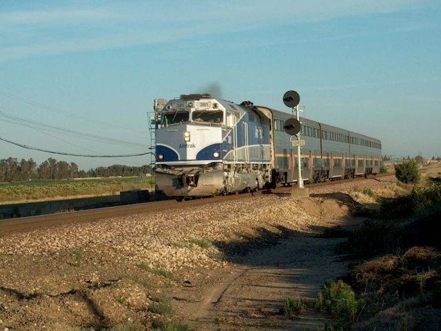One of the last runs of an F40PH on the San Joaquin was on June 9, 2001 when Amtrak 381, wearing Surfliner colors, marched past the target signals at Claus, just west of Modesto. The air horn seen just above the roofline of No. 381 actually belongs to the cab car trailing just behind the unit. Ironically, just when Amtrak found a paint scheme that looked good on the pug-nosed engines, they were retired. |