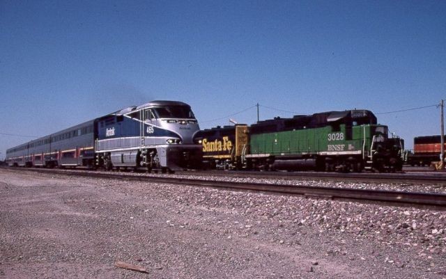 As equipment needs escalated due to route expansions Amtrak assigned a pair of their own newly delivered F59PHI units to the San Joaquin. Accelerating past BNSF 3028 in Riverbank Yard is Amtrak 455 in it's new Surfliner paint. Once Amtrak vacated BNSF's Riverbank depot the railroad pulled up the concrete station platforms, erasing all signs that the site once hosted a passenger train. |