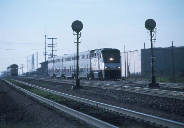 By March of 1999 this was the everyday face of the San Joaquin: F59PHs pulling solid sets of California Cars, equipment bought and paid for by the people of California thanks to a ballot measure voted in back on June 5, 1990. F59PHI 2006 accelerates away from Riverbank with Train 712 (bound for Oakland) while it's southtbound counterpart slows for it's own station stop.