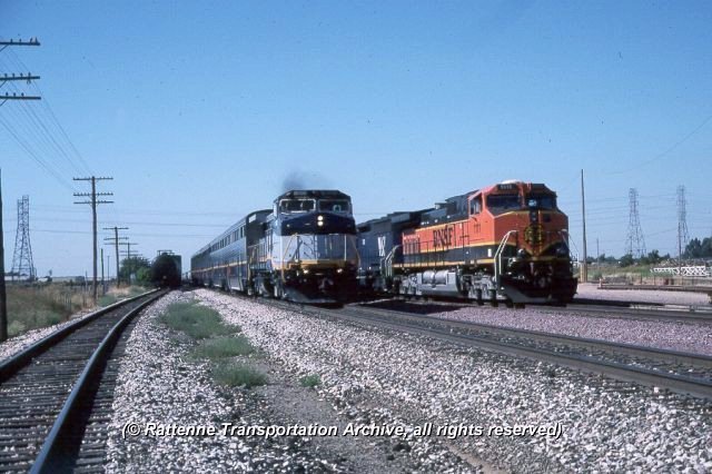 In addition to the initial nine F59PHI locomotives ordered by CalTrans, the agency also took delivery of a pair of B32-CH units from General Electric. CDTX 2051-2052 were built in 1992 and delivered as Amtrak 501-502 in full "Pepsi Can" regalia. To differentiate them the units were sublettered "CT" indicating CalTrans ownership. In this photo CDTX 2052 (a.k.a. ATK 502) passes BNSF 1111 at the east end of Riverbank Yard August of 2000. |