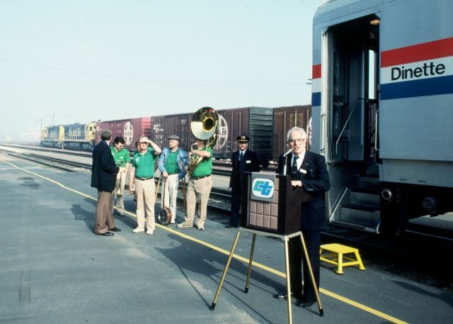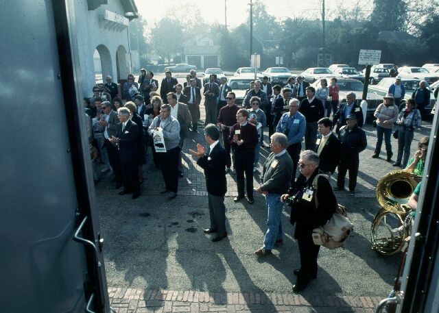 On December 18, 1989 CalTrans and Amtrak inaugurated a third San Joaquin roundtrip. The Inaugural special pauses at Riverbank as veteren Amtrak Public Relations man Art Lloyd says a few words to the waiting crowd of dignitaries and passengers anxiously waiting to board.  The Merced stop found a much larger crowd than at Riverbank. Merced is an important stop to Amtrak which bills it as  the Gateway To Yosemite, offering a dedicated bus connection to the park during the summer tourist season.