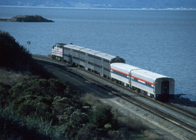 With an increase in Capital Corridor service, Amtrak was suddenly faced with a severe equipment shortage. As a temporary measure CalTrans loaned several gallery coaches and F40s from the CalTrain fleet to meet equipment demands. On November 29, 1993 F40PHR 296 hauls three CalTrain gallery cars and two Horizon Fleet cars through Pinole, bound for San Jose. |