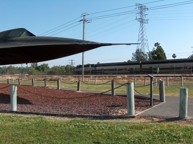 Afternoon Train 715 blasts by Castle Air Museum in the town of Atwater on April 27, 2004. The train is in push mode as it heads towards its' next station stop in Denair. Interestingly, San Joaquin trains have no specific orientation as to which direction is lead by a locomotive, as most push-pull operations do. Railfans never know from day to day whiich trains will have a unit leading or trailing. |