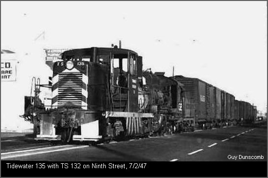 In addition to electric locomotives, the Tidewater rostered three steam locomotives: Two different 1-spots (officially rostered as No. 1), and No. 132. First No. 1, was a small engine used primarily as a construction locomotive while track crews graded roadbed and laid rail. It Second Engine No. 1, a product of the Rome Locomotive Works, had a long and glorious history. It started life as Rio Grande Western 39 and was delivered to that railroad in January of 1891, the same year Rome delivered Sierra Railroad's now-famous movie steamer, No. 3. It eventually found its way to the West Coast and sold to the fledgling Western Pacific as their 126. In 1918, a year after the Tidewater Southern was acquired by WP, No. 126 was transferred to the power-hungry railroad and renumbered to Tidewater second No. 1. Tidewater No. 132 was the last of its breed on the TS, closing out the railroad's steam era. The locomotive held a special place amongst followers of California shortlines because of its history as a former part of the Sierra Railroad's roster. Delivered in September of 1923 to the Sierra as their No. 32 , the Baldwin 2-6-2 was sold to the Tidewater on May 8, 1940. The locomotive's Sierra number stayed on the engine's cab sides until June 16, 1941, when it was renumbered 132 to eliminate a conflict with WP's 2-8-0 No. 32. Over the years, the Tidewater Southern has been the subject of a number of railfan excursions, most originating in the San Francisco Bay Area. One of the more interesting trips was a April 27, 1952 Oakland-to-Turlock roundtrip trip featuring sole survivor No. 132.